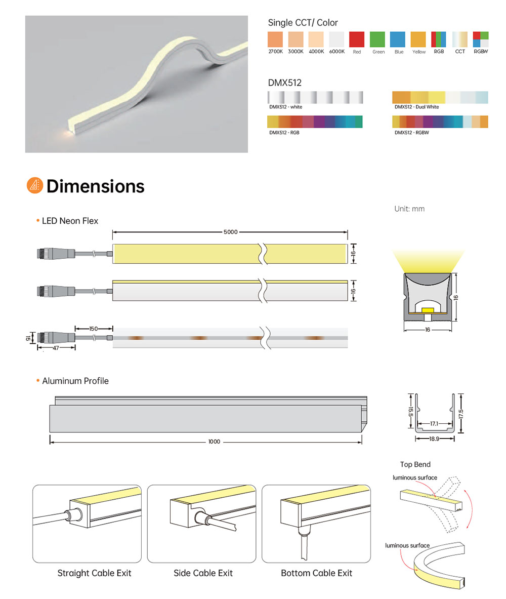This 1616 Top-Bend LED Neon Flex uses high brightness SMD2835 LED, 120 LEDs per meter with high light efficiency. Its housing is made by high-quality food-grade silicone, making it suitable for both indoor and outdoor applications. Its side-bend design (W16mm × H16mm) allows creative installations, while the high-CRI light source (80+, optional Ra90) ensures accurate color rendering and bright, uniform illumination. This LED Neon Flex is UV and saltwater resistant, providing durability against environmental factors.