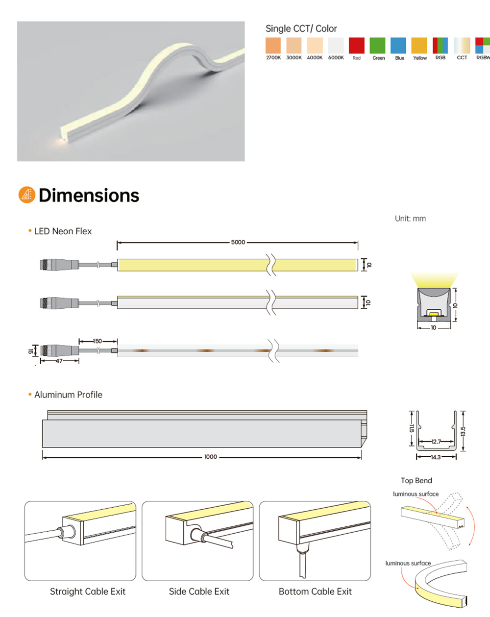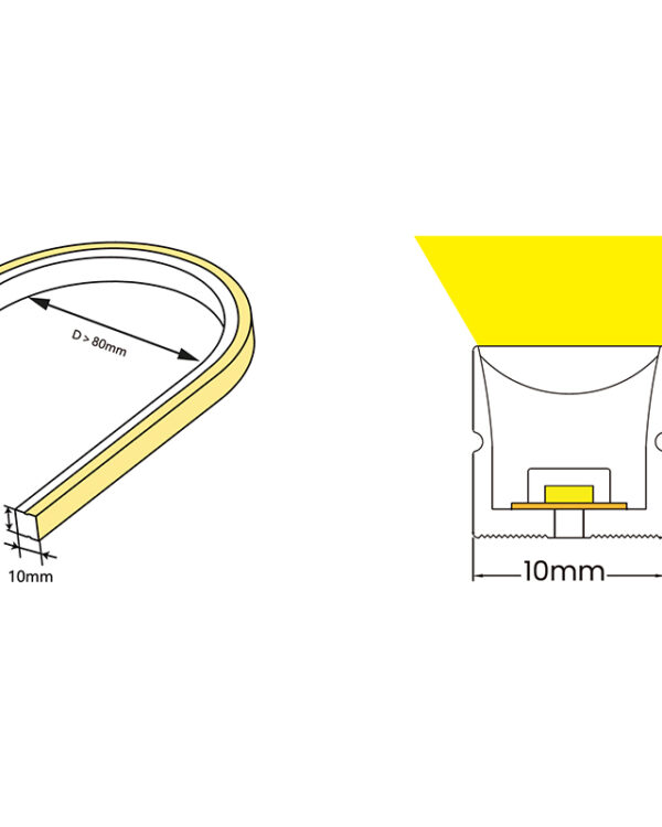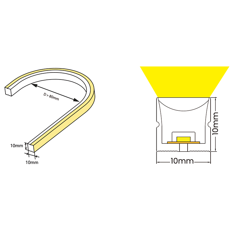 This 1010 Top-Bend LED Neon Flex uses high brightness SMD2835 LED, 120 LEDs per meter with high light efficiency. Its housing is made by high-quality food-grade silicone, making it suitable for both indoor and outdoor applications. Its top-bend design (W10mm × H10mm) allows creative installations, while the high-CRI light source (80+, optional Ra90) ensures accurate color rendering and bright, uniform illumination. This LED Neon Flex is UV and saltwater resistant, providing durability against environmental factors.