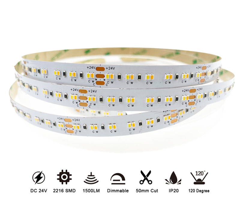 The CCT Tunable LED strip is using SMD2216 dual white LED with high CRI 90+, it features adjustable lights, selectable color temperature options between warm white 2700K and pure white 6000K.