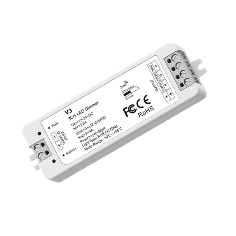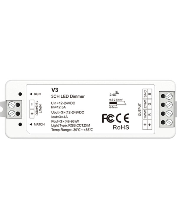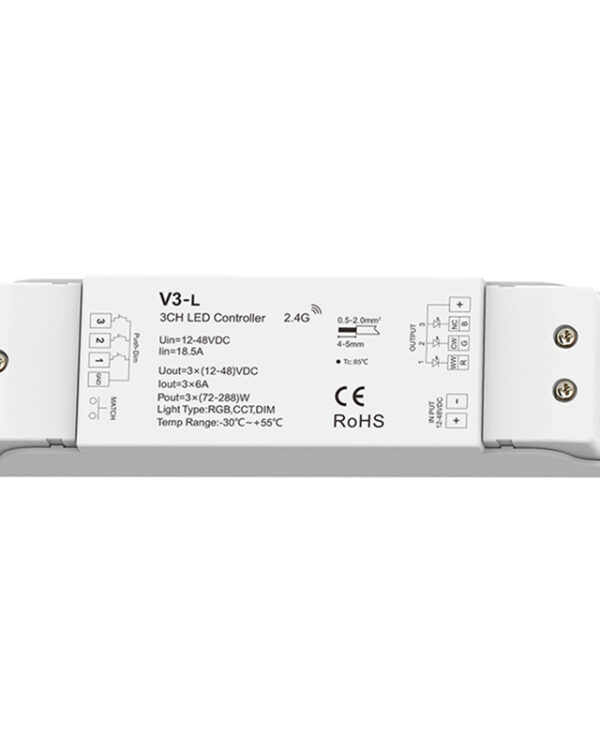 This controller is designed for RGB LED strips for RF wireless remote control use. There are two items for option, V3 & V3-L. Both can work with the RF remote RT4 or RT9.
