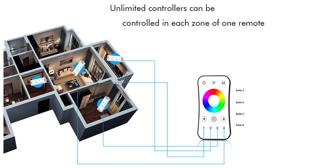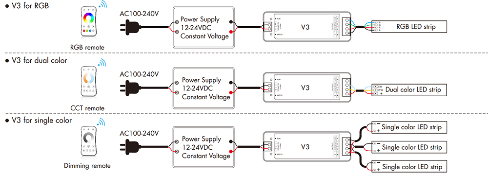 • Match with RF 2.4G single zone or multiple zone single color, dual color and RGB/RGBW remote control.